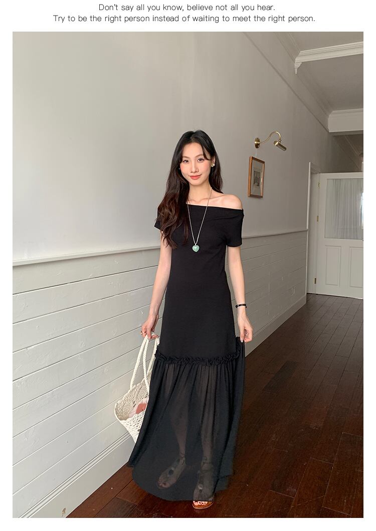 新たなトレンドを感じる、レディース オフショルダー リゾート ワンピース | ニット&シフォン裾|レイヤード風が登場しました!この魅力的なデザインは、軽やかさとエレガンスを兼ね備え、特別な日から日常まで幅広く活躍するアイテムです。オフショルダーのデザインが、女性らしさを引き立て、リゾートスタイルにぴったりな一着です!