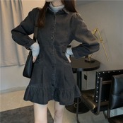 [39.99元で7,000ピース、49.98元] 女性用レトロブラックデニムドレス、春、秋、冬、新しいスタイル、Lサイズ、ファットmmデザイン、気質、スリム、フリルスカート | ワンピース専門 あのふじや