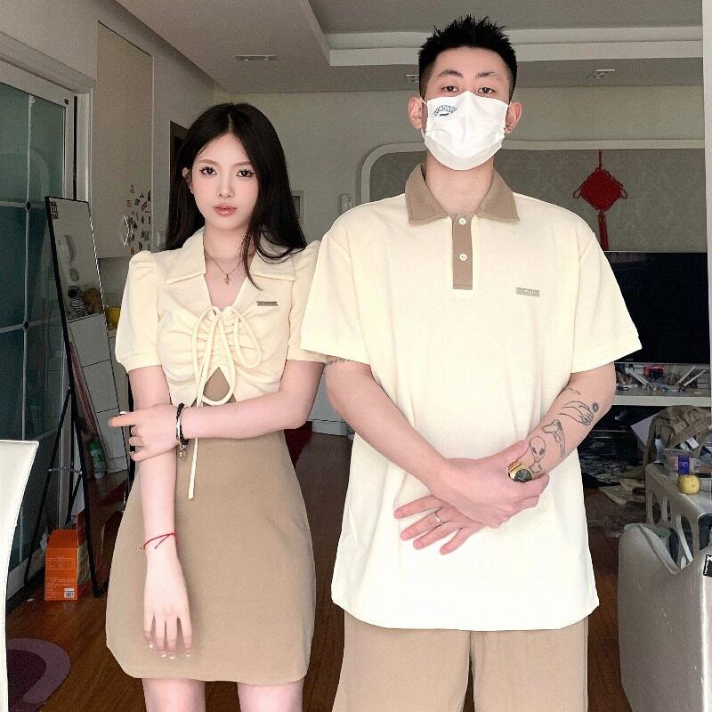 ニッチデザインカップル服 2023年夏韓国半袖Tシャツレディースドレスフレンチスタイルワンドレスワンドレストレンディー
